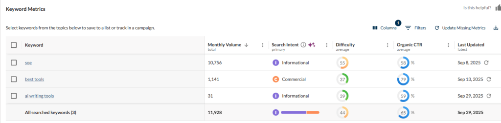 Analyzing important metrics is the backbone of the whole keyword research process. It’s because not every keyword is suitable for use in your content. You need to target specific words according to specific metrics.